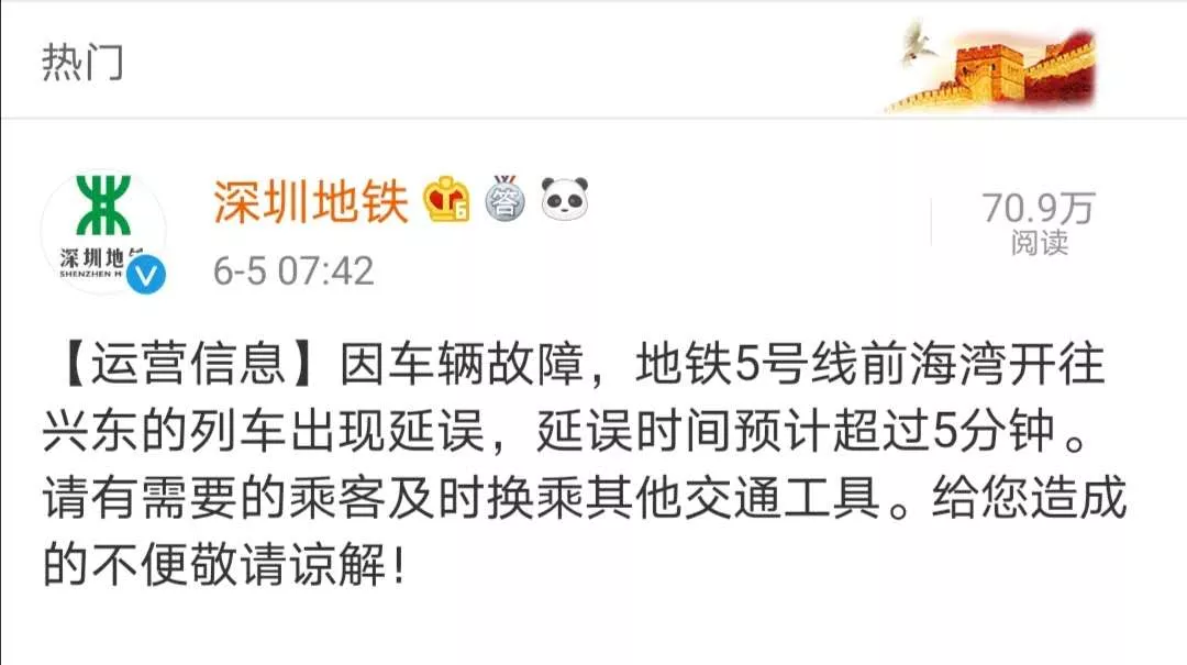 見圳客戶端·深圳新聞網(wǎng)2020年6月5日訊 今早7點42分深圳地鐵官方微博發(fā)布公告:因車輛故障,地鐵5號線前海灣開往興東的列車出現(xiàn)延誤,延誤時間預計超過5分鐘。
