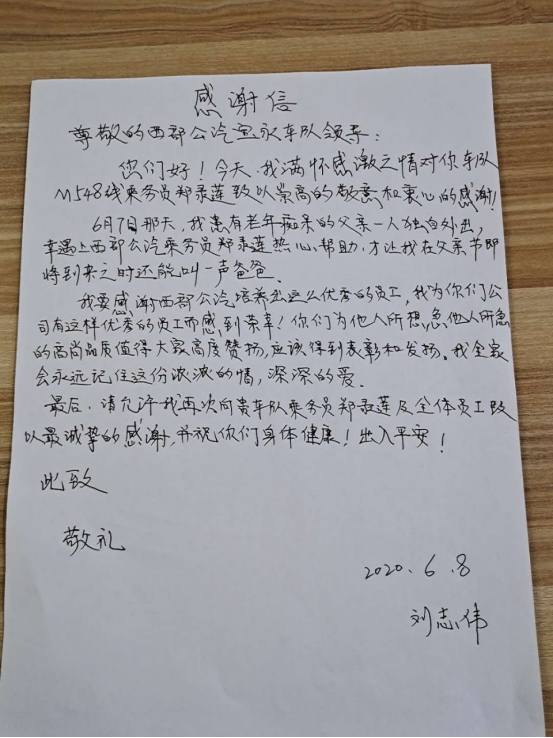 見圳客戶端·深圳新聞網(wǎng)2020年6月9日訊(深圳特區(qū)報記者 徐興東)6月9日早上,一位自稱劉先生的年輕人冒著滂沱大雨來到了西部公汽寶永車隊。一進辦公室,劉先生雙手捧著將親筆寫的一封感謝信呈給了隊助張喜鳳,并深有感觸地說道:“多災多難的父親有幸遇到乘務員鄭錄蓮的熱心幫助,并想方設(shè)法聯(lián)系上我。謝謝你們的成全,才讓我在父親節(jié)即將到來之時還能叫一聲爸爸,我將終生銘記諸位的大恩大德!”樸實無華的話語,感染了在場的每一個人,分明看出個個眼里都閃爍著晶瑩的喜悅淚花。