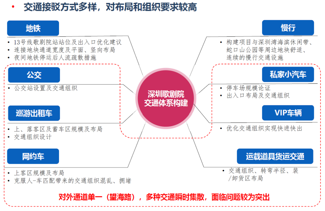 肯定了目前交通組織的總體方案,提出需充分利用地面望海路的交通疏散功能,考慮歌劇院作為地標(biāo)景點(diǎn)的吸引力,適當(dāng)增加停車位的彈性及可達(dá)性。同時建議市交通運(yùn)輸局需結(jié)合深圳歌劇院的建設(shè)重新對望海路地下快速路的規(guī)劃方案開展研究工作。