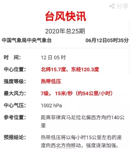 據(jù)@中央氣象臺,目前位于菲律賓呂宋島西部熱帶低壓即將移入南海東部海面,強(qiáng)度逐漸增強(qiáng),12小時內(nèi)將發(fā)展成為今年第2號臺風(fēng)鸚鵡,并將于14日白天在廣東西部一帶沿海登陸(23-28米/秒,熱帶風(fēng)暴級或強(qiáng)熱帶風(fēng)暴級),登陸后強(qiáng)度逐漸減弱。