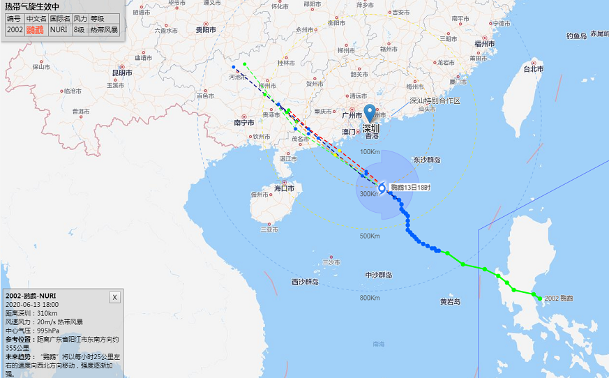06月14日12時(shí),2002號(hào)臺(tái)風(fēng)“鸚鵡”(熱帶風(fēng)暴級(jí))的中心位于陽(yáng)江市陽(yáng)西縣,中心附近最大風(fēng)力8級(jí),向西北方向移動(dòng),強(qiáng)度逐漸減弱,下午將進(jìn)入廣西。截止目前深圳(含深汕)出現(xiàn)中雨局部大雨和6-9級(jí)陣風(fēng)。今天午后有間歇性(雷)陣雨,降雨時(shí)伴有6-7級(jí)陣風(fēng)。