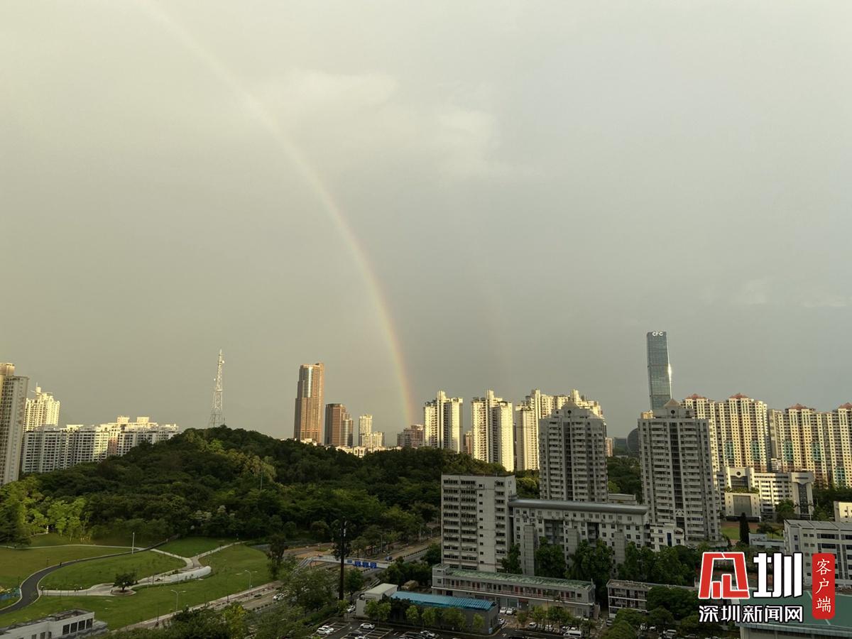 今天(16日)傍晚,深圳雨后雙彩虹橫跨天際,景象絢麗唯美,引得路人紛紛駐足拍照。