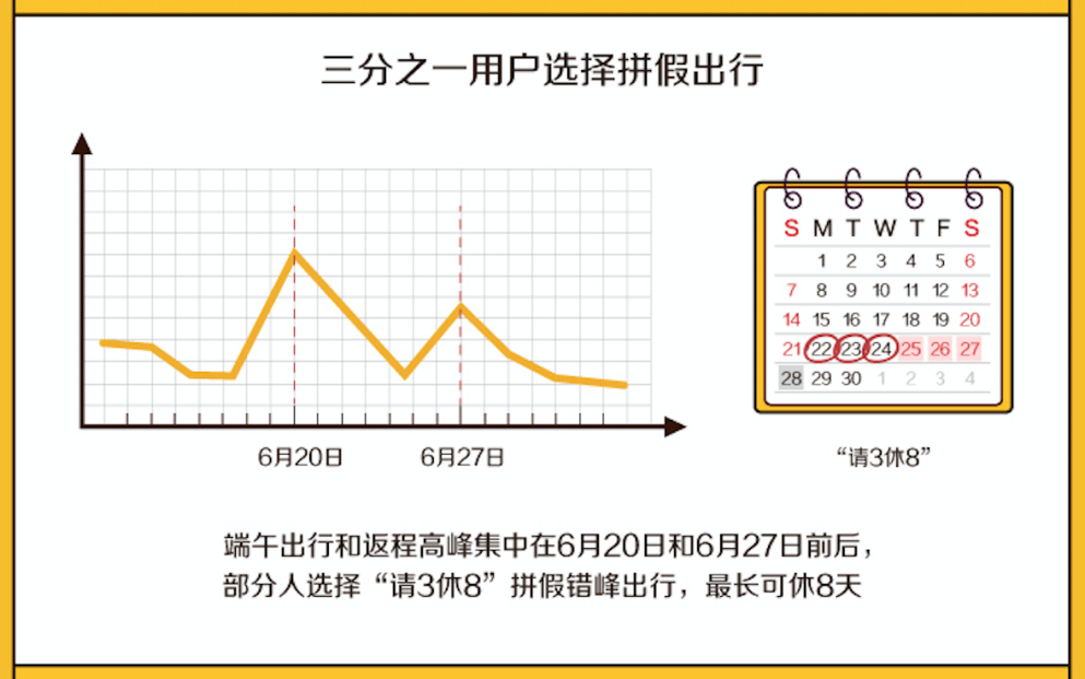 今年端午假期集中在周末,不少上班族會選擇“請3休8”拼假錯峰出行,享受8天超長假日。美團(tuán)大數(shù)據(jù)顯示,端午出行和返程高峰分別集中在6月20日和6月27日前后,三分之一用戶會選擇拼假出行。