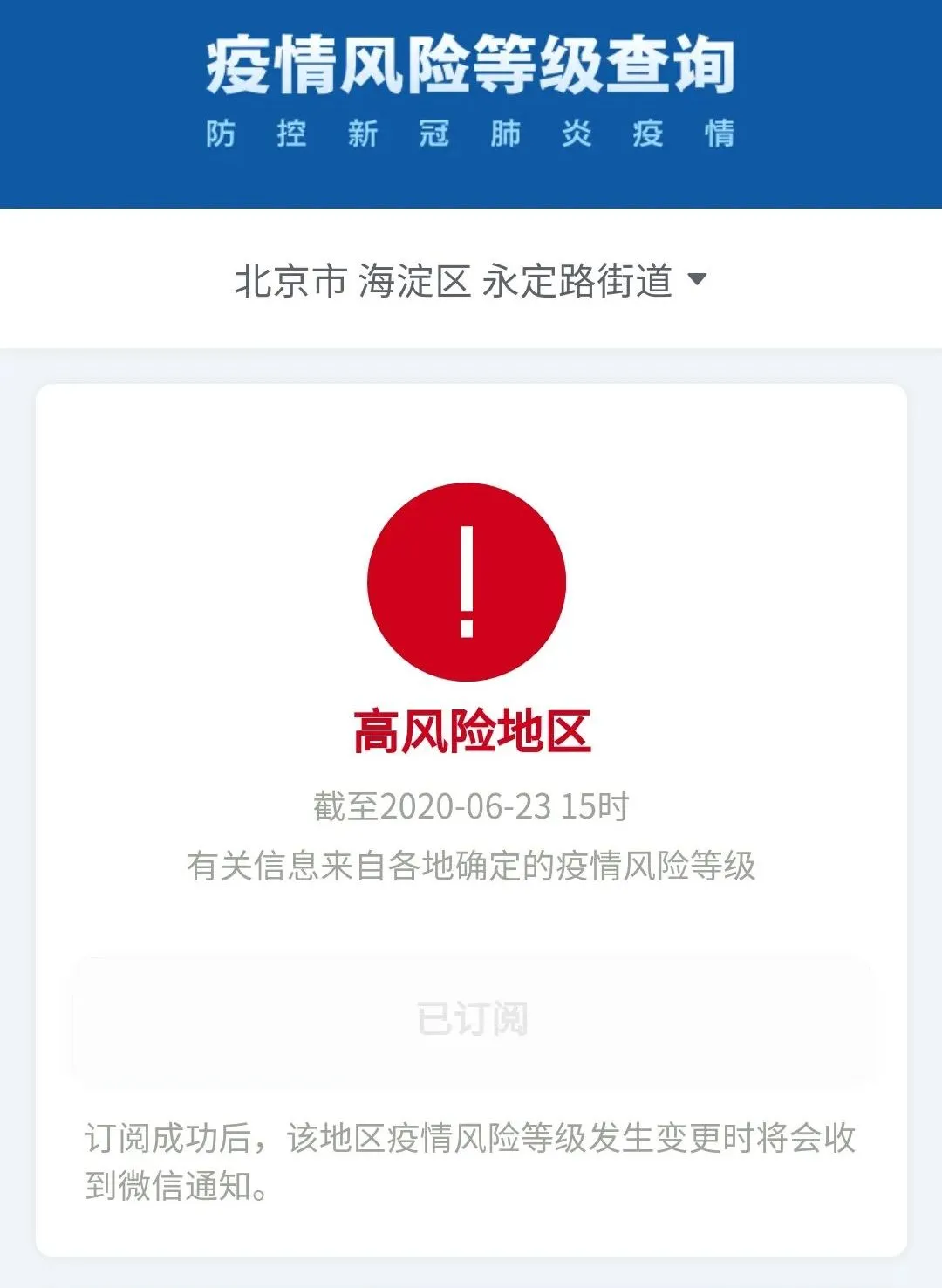截至6月23日15時(shí),北京市海淀區(qū)永定路街道由中風(fēng)險(xiǎn)調(diào)整為高風(fēng)險(xiǎn)。