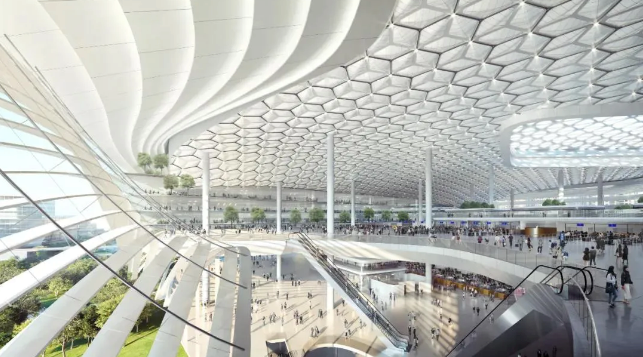 主創(chuàng)團(tuán)隊介紹,新皇崗口岸的設(shè)計以“國之重器”為概念?!皣仄鳌闭w形態(tài)對稱、穩(wěn)固,輔以新型石材主導(dǎo)的幕墻系統(tǒng),采用外立面虛實相間的材料運(yùn)用,充滿未來感;抬高的景觀基座抬升主體,氣勢莊重;建筑整體以充滿力量感的純凈體量,寄喻口岸為大灣區(qū)發(fā)展的基石重器。