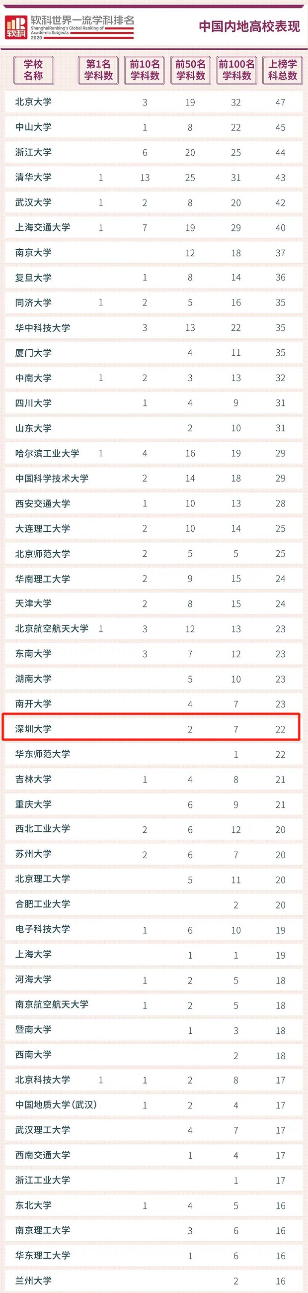 見圳客戶端·深圳新聞網(wǎng)2020年6月29日訊(見圳客戶端、深圳新聞網(wǎng)記者 梁榆其 金洪竹)6月29日,軟科正式發(fā)布2020“軟科世界一流學(xué)科排名”,排名覆蓋54個(gè)學(xué)科,涉及理學(xué)、工學(xué)、生命科學(xué)、醫(yī)學(xué)和社會(huì)科學(xué)五大領(lǐng)域,中國(guó)內(nèi)地共有253所高校上榜。深圳大學(xué)(以下簡(jiǎn)稱“深大”)共有22個(gè)學(xué)科上榜,上榜學(xué)科數(shù)領(lǐng)跑地方高校,總上榜學(xué)科數(shù)位列中國(guó)內(nèi)地高校26位,其中,7個(gè)學(xué)科位列世界百?gòu)?qiáng),2個(gè)學(xué)科進(jìn)入世界50強(qiáng)。