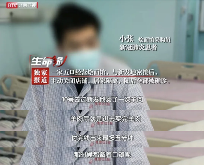 據(jù)小張回憶,6月10日,他在新發(fā)地牛羊肉大廳購物不超過5分鐘,且全程佩戴了口罩但還是“中招”了。