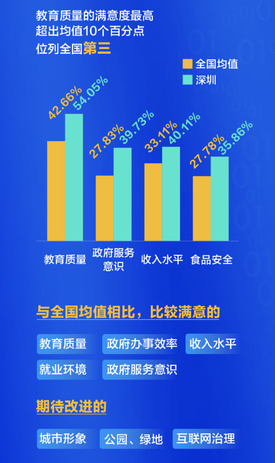 在針對(duì)城市治理能力和社會(huì)服務(wù)的20多項(xiàng)滿意度指標(biāo)中,深圳有19項(xiàng)高于全國(guó)省會(huì)城市和直轄市平均水平。其中,市民對(duì)教育服務(wù)的滿意度最高,超出均值10個(gè)百分點(diǎn),位列全國(guó)第三,其次是治安狀況和水、空氣質(zhì)量,而在政府服務(wù)意識(shí)和食品安全的滿意度,也排在全國(guó)同類第一名。此外,日常生活中的收入和就業(yè),也讓深圳人感覺(jué)比較踏實(shí)。