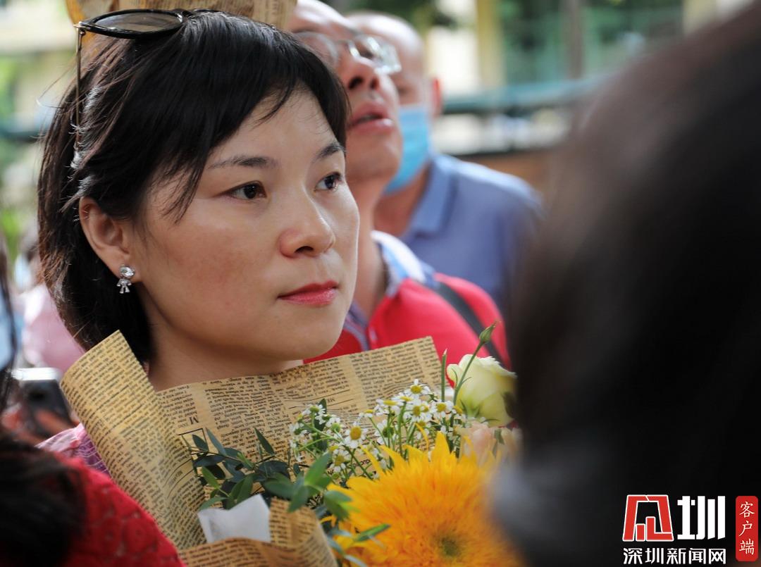 深圳高級中學考點外家長受捧鮮花、滿懷期待。