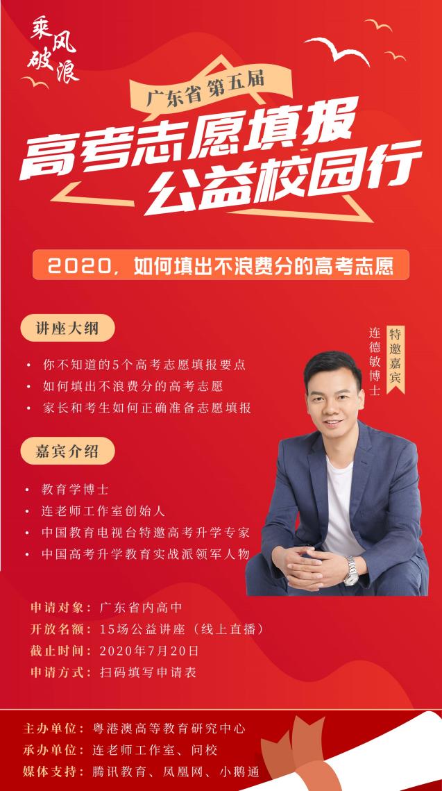 見圳客戶端·深圳新聞網2020年7月9日訊 (記者 陳彬)高考是每一位高三學子夢想的起點,但高考不只是一場考試,還有考試之后的志愿填報;如何科學、專業(yè)的填報志愿,直接關系著考生能否獲得心儀大學和專業(yè)的錄取。7月6日,以《2020,如何填出不浪費分的高考志愿》為主題的廣東省第五屆高考志愿填報公益校園行正式啟動,該活動由粵港澳高等教育研究中心主辦,連老師工作室承辦,將面向廣東省內高中,以學校或班級為單位,舉辦15場志愿填報公益講座,講座全程特邀連德敏博士擔任主講嘉賓。