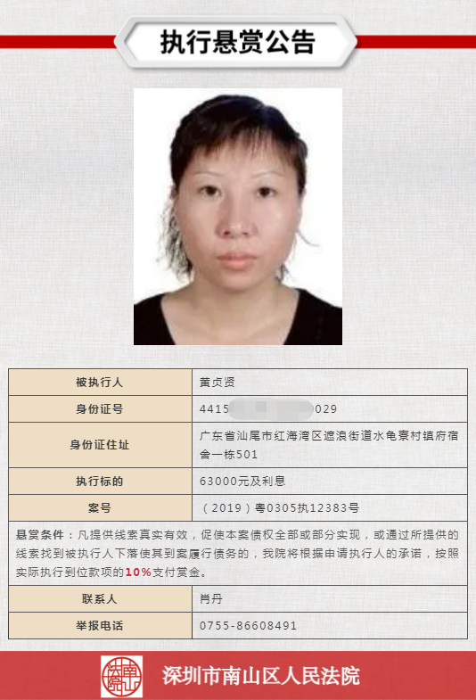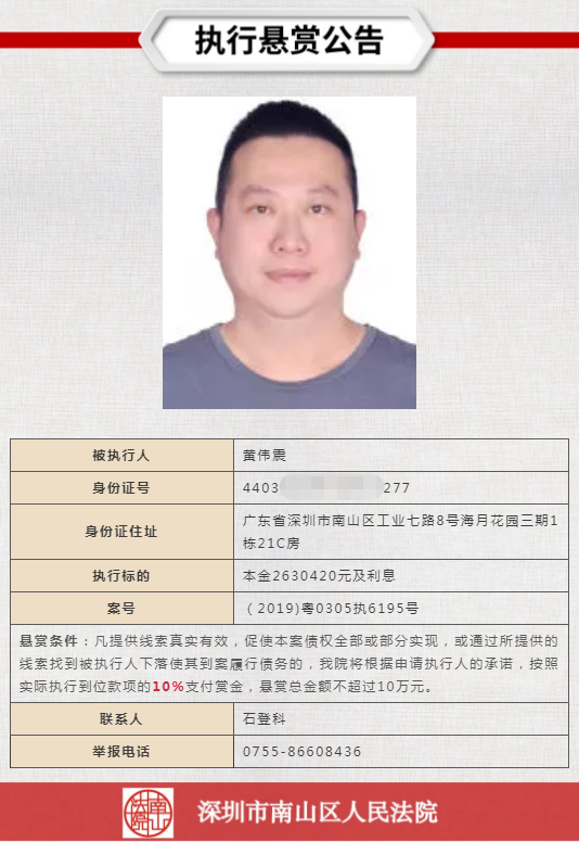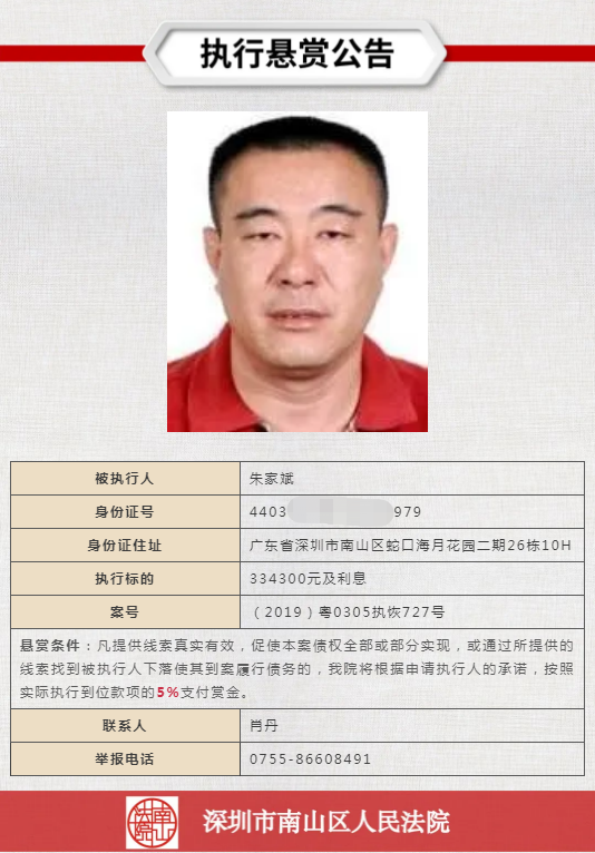 經(jīng)申請(qǐng)執(zhí)行人申請(qǐng),深圳市南山區(qū)人民法院向社會(huì)發(fā)布懸賞舉報(bào)公告,凡提供線索真實(shí)有效,促使本案?jìng)鶛?quán)全部或部分實(shí)現(xiàn),或通過(guò)所提供的線索找到被執(zhí)行人下落使其到案履行債務(wù)的,深圳市南山區(qū)人民法院將根據(jù)申請(qǐng)執(zhí)行人的承諾,按照實(shí)際執(zhí)行到位款項(xiàng)給予一定金額的賞金。