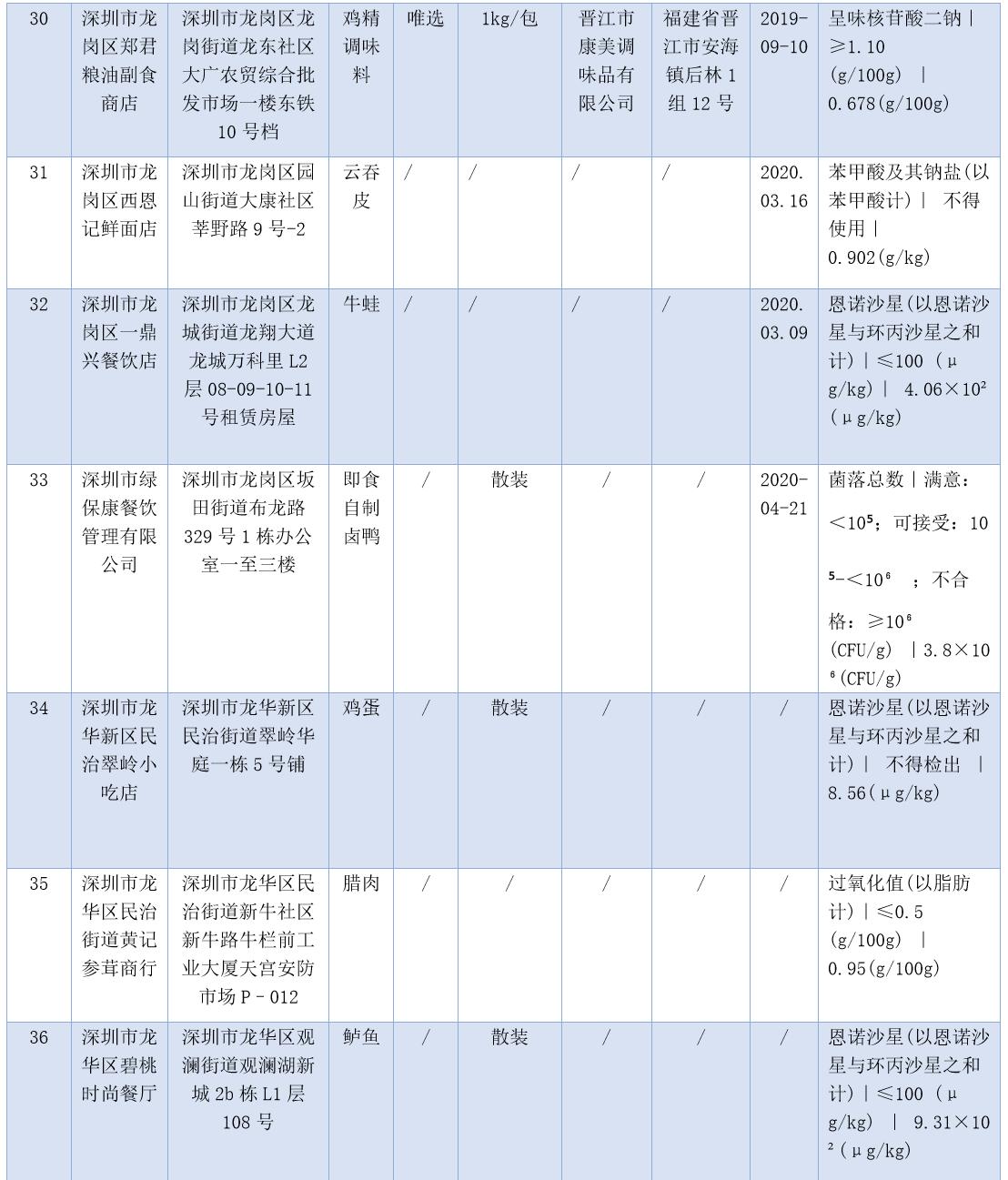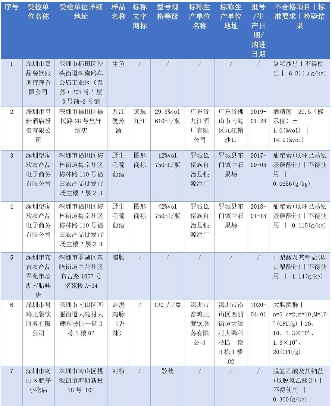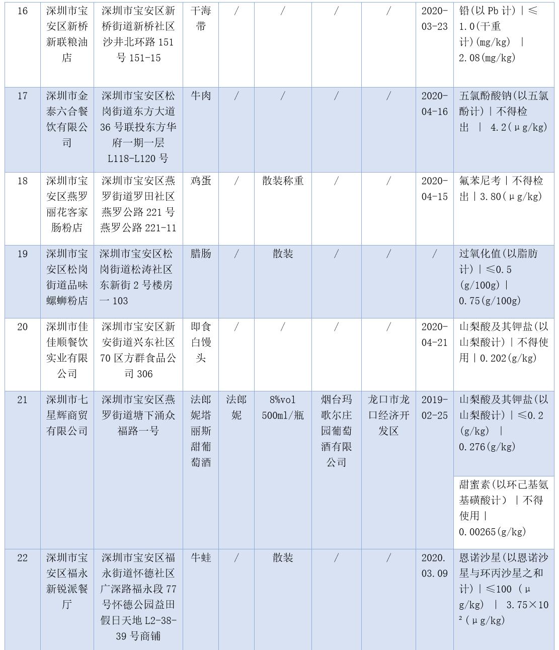 見(jiàn)圳客戶(hù)端·深圳新聞網(wǎng)2020年7月17日訊(晶報(bào)記者 鄧裴裴/制圖)7月17日,深圳市市場(chǎng)監(jiān)督管理局官網(wǎng)發(fā)布了2020年第二十二期食品安全抽樣檢驗(yàn)情況通報(bào),3-5月,共抽檢生產(chǎn)、流通、餐飲環(huán)節(jié)食品1229批次,發(fā)現(xiàn)不合格樣品47批次。記者注意到,不少不合格樣品抽檢單位為餐飲店,包括皇軒酒店、窯雞王、愛(ài)上牛蛙、御可奶茶等,還有些小吃店、腸粉店、螺獅粉店紛紛上榜。涉及不合格項(xiàng)目類(lèi)別包括農(nóng)藥殘留、獸藥殘留、食品添加劑、微生物污染、品質(zhì)指標(biāo)、金屬等元素污染物。