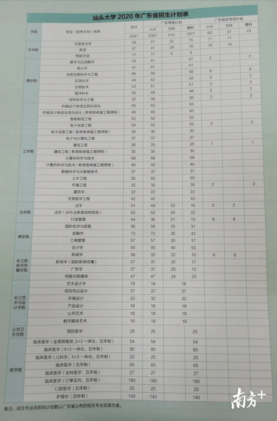 汕大本科生招生計(jì)劃數(shù)為3100人,新增預(yù)防醫(yī)學(xué)、藥學(xué)專(zhuān)業(yè),分別招生30人、20人,并增加新聞學(xué)專(zhuān)業(yè),新增國(guó)際新聞傳播方向,招生45人。