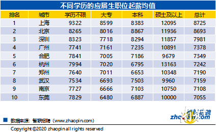 上海、北京、深圳、廣州這些一線城市的應(yīng)屆生平均起薪相對(duì)較高。一般而言,在各城市中,隨著學(xué)歷的提高,應(yīng)屆生起薪也會(huì)相應(yīng)增加。但由于職業(yè)或行業(yè)的人才缺口較大,使得某些職位盡管學(xué)歷不限或僅要求大專學(xué)歷,但其薪酬卻相對(duì)較高。例如,上海有的職位學(xué)歷不限或要求大專以上,但起薪要高于本科崗位,這也間接反映出應(yīng)屆生就業(yè)市場存在明顯的結(jié)構(gòu)矛盾。