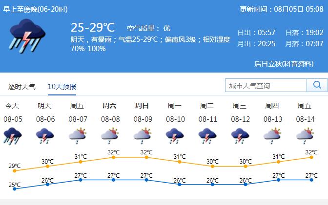 見圳客戶端·深圳新聞網(wǎng)2020年8月5日訊 今日我市陰天,有暴雨;氣溫25-29℃;偏南風(fēng)3級(jí);相對(duì)濕度70%-100%。深圳市氣象臺(tái)于2020年8月5日5時(shí)15分在全市發(fā)布雷電預(yù)警,今天上午海上將不斷有降雨云團(tuán)生成,受其影響我市有零散雷暴;未來6小時(shí)累計(jì)雨量將達(dá)暴雨,深圳市氣象臺(tái)于2020年8月5日5時(shí)40分在全市發(fā)布暴雨黃色預(yù)警,全市進(jìn)入暴雨戒備狀態(tài),需注意防范。市民停留在安全地方;按照防御預(yù)案停止戶外易燃易爆危險(xiǎn)作業(yè),并加強(qiáng)危化場(chǎng)所安全管理。