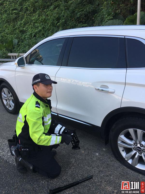 事情發(fā)生在10月11日早上10時30分許,劉先生駕車出外辦事,車輛行駛至東環(huán)高架西往東方向時,突然一聲巨響左后輪輪胎爆裂車輛半路拋錨,當時正值交通早高峰,過往車輛不斷,故障車輛停在道路中間導致路段交通擁堵,車主劉先生一時間不知所措,只能留在原地等待救援。此時正在執(zhí)行巡邏任務的羅湖交警鐵騎組長陳展廷見狀,立即停下警車上前查看情況,了解情況后,為了緩解該路段的交通擁堵,防止出現(xiàn)交通意外,陳展廷立即讓劉先生把車??吭谧钣覀溶嚨溃缓蟀才抨爢T用警車在故障車輛周邊設置出了安全警戒區(qū)域,另一位隊員則對過往車輛進行指揮疏導及勸慰駕駛人不要著急,在安全區(qū)域等待,陳展廷則俯下身為爆胎車輛更換輪胎。約15分鐘的忙碌后,三位鐵騎隊員已滿身是汗,但在他們的密切協(xié)調配合下,快速幫助駕駛人劉先生擺脫困境,險情在最短時間內(nèi)被及時排除,道路交通秩序也恢復正常,這暖心一幕讓劉先生很是感動,緊緊握著陳展廷同志的手連聲表示感謝。