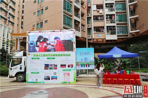 在漁民村文化廣場,垃圾分類宣傳車上的LED屏幕播放著垃圾分類減量宣傳視頻,供社區(qū)居民觀看學習,據(jù)悉,這是全市首輛垃圾分類宣傳大篷車。而此輛垃圾分類宣傳車從漁民村發(fā)車也有著重要意義,上世紀70年代,漁民村趁著改革開放的春風,發(fā)掘地域的優(yōu)勢,做出了改革的第一步嘗試,經(jīng)過四十多年的發(fā)展,漁民村不僅夯實了物質(zhì)基礎(chǔ),更是在精神文明層面上有了長足的發(fā)展,如今漁民村也成立了自己的志愿服務組織—深圳市羅湖區(qū)民樂志愿者協(xié)會。