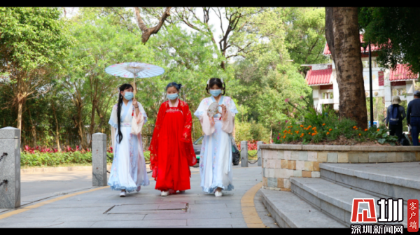 風(fēng)景如畫的東湖公園吸引來了不少漢服愛好者,她們身著霓裳羽衣,手撐紙傘,步履輕盈,五彩繽紛的服飾與滿園的春色相映生輝,一幅春天最美的畫卷就這樣在眼前展開。穿漢服的小姐姐們告訴記者,她們是專程從龍華過來的,因?yàn)楹芟矚g漢服又正值踏青賞花好風(fēng)光,特地與好友來東湖公園一起記錄春天的精彩瞬間。