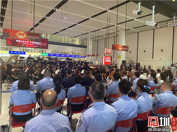 作為慶祝中國(guó)共產(chǎn)黨成立100周年專題節(jié)目、蓮塘邊檢站黨史教育學(xué)習(xí)專題活動(dòng),音樂會(huì)在莊嚴(yán)神圣的升旗儀式中拉開序幕,深圳交響樂團(tuán)的68名資深演奏人員在嶄新的出入境邊防檢查通道前,奏響了一首首紅色經(jīng)典旋律,與現(xiàn)代化的口岸邊防檢查設(shè)施交相輝映,激蕩回響、動(dòng)人心魄,體現(xiàn)蓮塘邊檢站全體民警對(duì)黨忠誠(chéng)、服務(wù)人民、執(zhí)法公正、紀(jì)律嚴(yán)明的赤膽忠誠(chéng)。音樂會(huì)在《沒有共產(chǎn)黨就沒有新中國(guó)》雄壯的齊唱聲中結(jié)束。