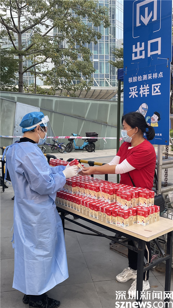 在筍崗街道初心公園核酸檢測(cè)點(diǎn),市民在進(jìn)行核酸檢測(cè)后可以去領(lǐng)取一瓶牛奶。據(jù)了解,這是深圳愛心企業(yè)專門為市民和醫(yī)護(hù)人員捐贈(zèng)的,這一瓶瓶牛奶在深圳的冬天向醫(yī)護(hù)人員和市民送上了一份溫暖。