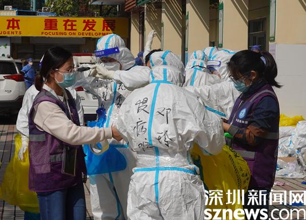 臘八節(jié)剛過,深圳帶著些許涼意,卻也是艷陽高照?!巴緜儯嗷z查一下手腕腳腕有沒有貼好!穿戴整齊后準(zhǔn)備集結(jié)出發(fā)啦!”在封控區(qū)外圍的醫(yī)護(hù)人員整備區(qū),一群身穿防護(hù)服、全副“武”裝的工作人員整裝待發(fā),兩人一組,目光堅(jiān)定,向著封控區(qū)的入口走去。