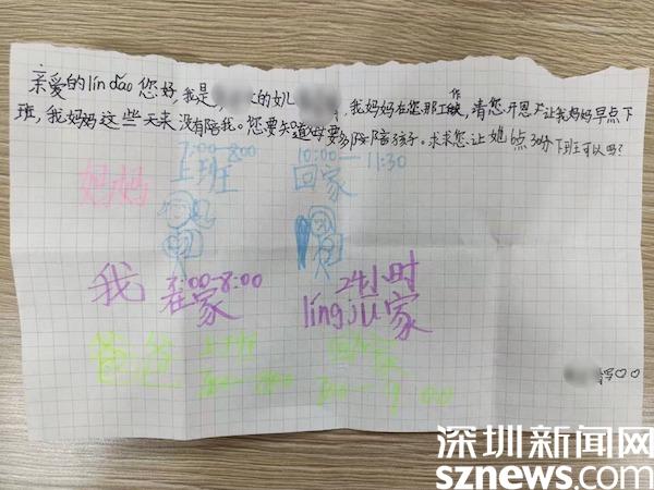 “親愛的lín dǎo您好……我媽媽在您那工作,這些天都沒能陪我,請(qǐng)你讓她6點(diǎn)30分下班可以嗎?”,1月13日,羅湖區(qū)南湖街道羅湖社區(qū)黨委書記姜德榮收到了一封特別的來信。這封信來自社區(qū)工作人員彭女士可愛的女兒,信上的內(nèi)容圖文并茂,表達(dá)了一個(gè)10歲小女孩的小心愿,希望媽媽可以早點(diǎn)下班,回家陪她。