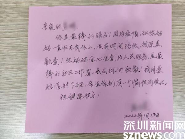 讀特客戶端·深圳新聞網(wǎng)1月13日訊(見習(xí)記者 覃鈺清 通訊員 張晴晴)“親愛的lín dǎo您好……我媽媽在您那工作,這些天都沒能陪我,請(qǐng)你讓她6點(diǎn)30分下班可以嗎?”,1月13日,羅湖區(qū)南湖街道羅湖社區(qū)黨委書記姜德榮收到了一封特別的來信。這封信來自社區(qū)工作人員彭女士可愛的女兒,信上的內(nèi)容圖文并茂,表達(dá)了一個(gè)10歲小女孩的小心愿,希望媽媽可以早點(diǎn)下班,回家陪她。