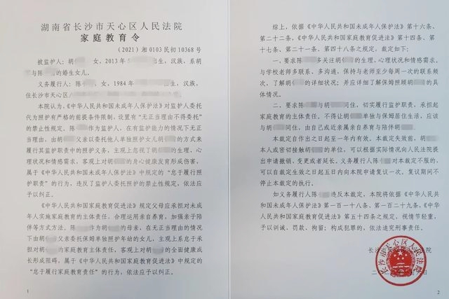 全國(guó)首份家庭教育令由長(zhǎng)沙市天心區(qū)人民法院發(fā)出。