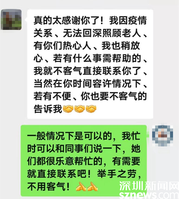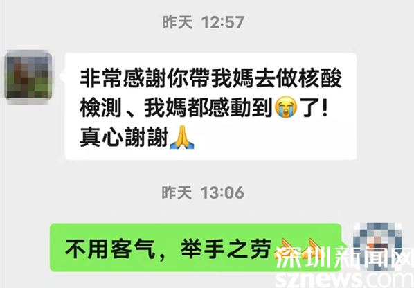 原來,“紅馬甲”是老圍社區(qū)網(wǎng)格員劉珍蓮,她陪老人李曉萍來做核酸檢測。檢測順利結(jié)束,老人一激動,就抱著劉珍蓮哭了起來。事后,老人的兒子,身在香港的溫先生給劉珍蓮發(fā)來微信,說:“非常感謝你帶我媽去做核酸檢測,我媽都感動到哭了。”