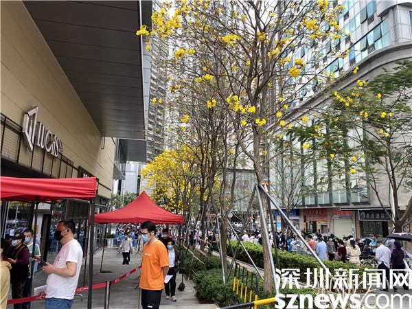 在國(guó)速中心廣場(chǎng),黃花鈴木開得正好,藍(lán)天白云下是有序的核酸檢測(cè)隊(duì)伍,“大白”和“小藍(lán)”們正忙碌不停。據(jù)悉,這是桂園街道所屬的松園社區(qū)的一個(gè)核酸檢測(cè)點(diǎn),地處于商業(yè)旺區(qū)附近,人口較多,所以核酸檢測(cè)隊(duì)伍也相對(duì)其他核酸檢測(cè)點(diǎn)長(zhǎng)。羅湖區(qū)政協(xié)委員、深圳市國(guó)速房地產(chǎn)開發(fā)有限公司董事長(zhǎng)黃少兵表示,這個(gè)核酸檢測(cè)點(diǎn)從1月初就設(shè)立了,“由于國(guó)速中心廣場(chǎng)較寬敞,滿足了通風(fēng)和人流需求?!?/p>