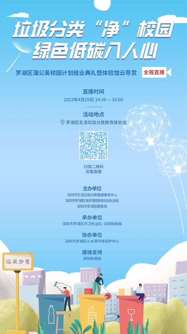 4月29日下午2:30—4:00,羅湖區(qū)首期蒲公英教師培訓(xùn)迎來結(jié)業(yè),羅湖區(qū)垃圾分類體驗館館經(jīng)歷多月重整布展后煥新重開,屆時,深圳市生活垃圾分類管理事務(wù)中心、羅湖區(qū)城市管理和綜合執(zhí)法局和羅湖區(qū)教育局共同舉辦垃圾分類“凈”校園綠色低碳入人心——羅湖區(qū)蒲公英校園計劃結(jié)業(yè)典禮暨科普館云導(dǎo)賞活動,深圳新聞網(wǎng)將進行全程直播,歡迎各位網(wǎng)友觀看。