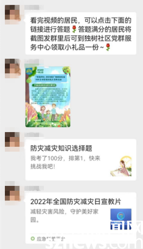 “原來,用滅火器滅火時,滅火器的噴射口應(yīng)該對準(zhǔn)火焰的根部”“電腦著火了,應(yīng)立即拔掉電源后用濕棉被蓋住電腦,而不是給電腦澆水”“震級相差一級,釋放能量相差約32倍”......微信群里,居民群眾一邊觀看學(xué)習(xí)視頻,一邊積極分享學(xué)習(xí)心得、開展熱烈討論。當(dāng)日,社區(qū)居民李女士連續(xù)作答兩次,均未獲得滿分,不由得感嘆:“這些內(nèi)容看似了解,實操起來還是有點分不清楚,通過學(xué)習(xí)和答題,重新認(rèn)識了防災(zāi)減災(zāi)的重要性,增長了防災(zāi)減災(zāi)知識。”