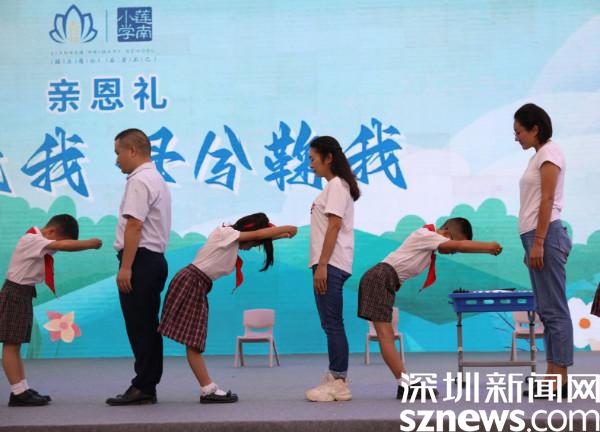 活動由詩歌吟唱《鹿鳴》拉開了序幕?!案纲馍?,母兮鞠我”,熒幕上播放著子女和父母溫馨互動的視頻,隨后上演的親恩禮,表達了子女對父母的深深愛意。當主持人問到一位家長時,她眼含熱淚地說:“我此刻很激動也很幸福,孩子給我捶背還給我寫卡片,感謝這次儀式感滿滿的活動,拉進了我們家長和孩子的距離,真的非常暖心!”