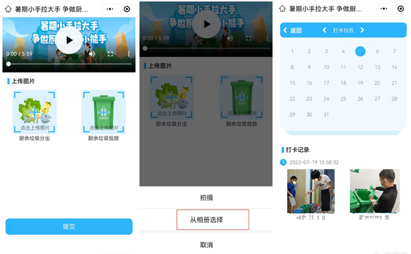 需要注意的是,學生在上傳照片時,須上傳每日廚余分類和廚余投放照片,不可重復使用同一張照片進行打卡,當日多次上傳照片僅記錄打卡簽到1次;此外,如上傳與廚余垃圾分類無關的照片,系統(tǒng)將自動作廢當次打卡,判定該次打卡無效。