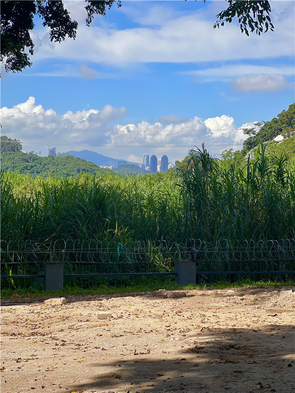 陽光炙烤著大地,綠樹環(huán)繞成蔭,近處是生機(jī)盎然的灌木叢,遠(yuǎn)處是一派城市光景,別有趣味。