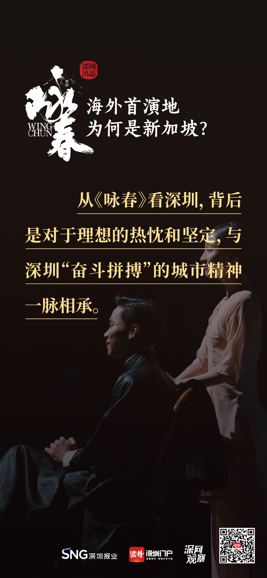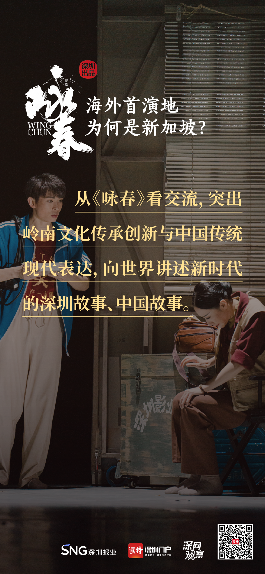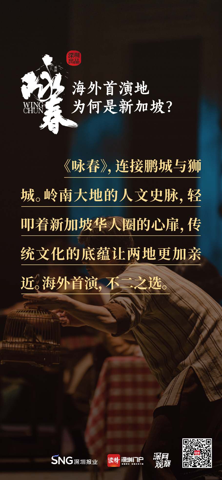 《詠春》書(shū)寫平凡英雄的傳奇,開(kāi)詠春的一扇門,只為追尋心中的那一束光?!对伌骸?,連接鵬城與獅城,嶺南大地的人文史脈,輕叩著新加坡華人圈的心扉,傳統(tǒng)文化的底蘊(yùn)讓兩地更加親近,海外首演,不二之選。