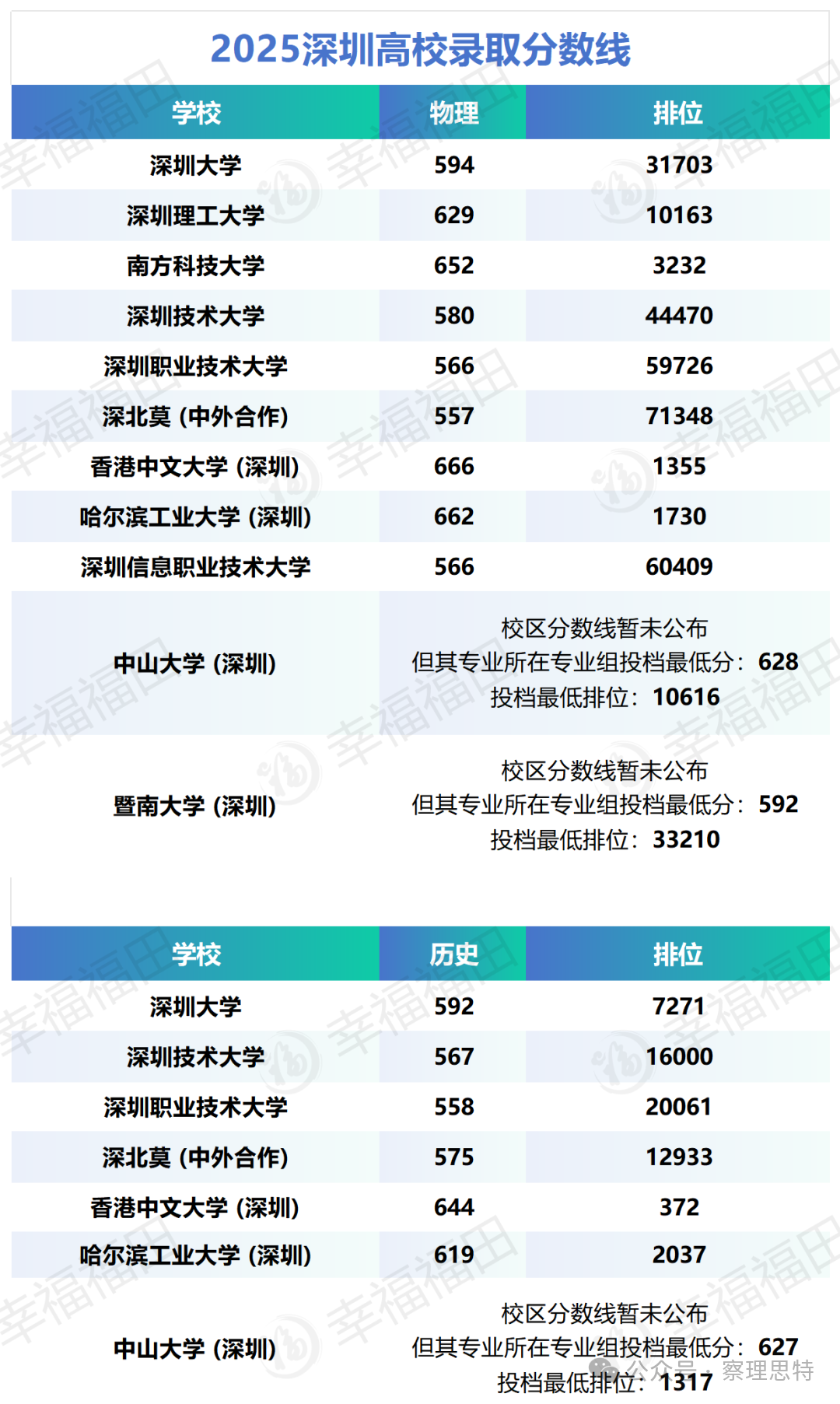 從整體數(shù)據(jù)來(lái)看,深圳高校在物理類投檔中表現(xiàn)尤為突出,哈爾濱工業(yè)大學(xué)(深圳)、南方科技大學(xué)、深圳理工大學(xué)在省內(nèi)高校中位居前3。歷史類投檔中,深圳高校同樣表現(xiàn)不俗,哈爾濱工業(yè)大學(xué)(深圳)、深圳大學(xué)在全省所有高校中排名前10,反映出深圳高校文理均衡發(fā)展的良好態(tài)勢(shì)。