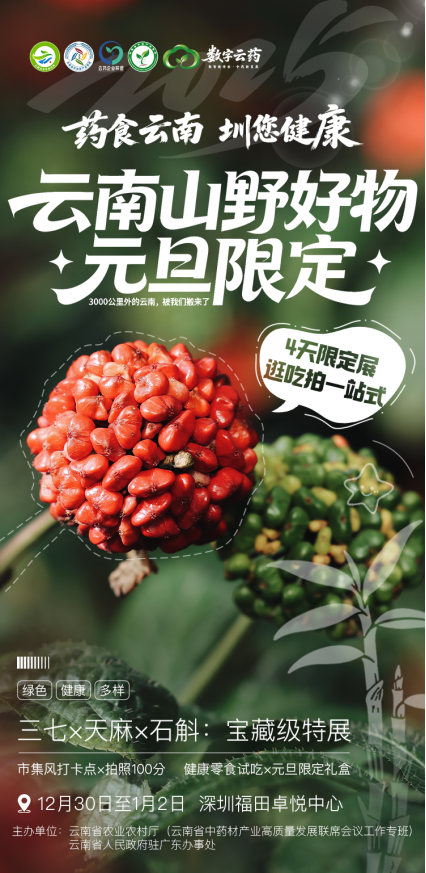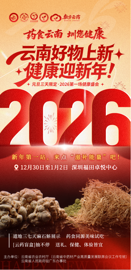 由云南省農(nóng)業(yè)農(nóng)村廳、云南省人民政府駐廣東辦事處主辦的“藥食同源·圳在健康”展銷活動(dòng)將于2025年12月30日至2026年1月2日在卓悅中心亮相,覆蓋整個(gè)元旦假期。云南白藥、華信三七、騰藥、滋仙草等來自云嶺高原的代表性品牌將悉數(shù)到場(chǎng),與深圳市民近距離見面。