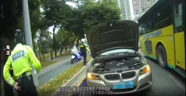 1月19日晚,羅湖交警筍崗中隊鐵騎隊員彭鉞崴、陳培斌巡邏至深圳市羅湖區(qū)泥崗路輔道轉北環(huán)大道路段時,發(fā)現一輛煙霧彌漫著的小車突發(fā)故障,停放在路邊。