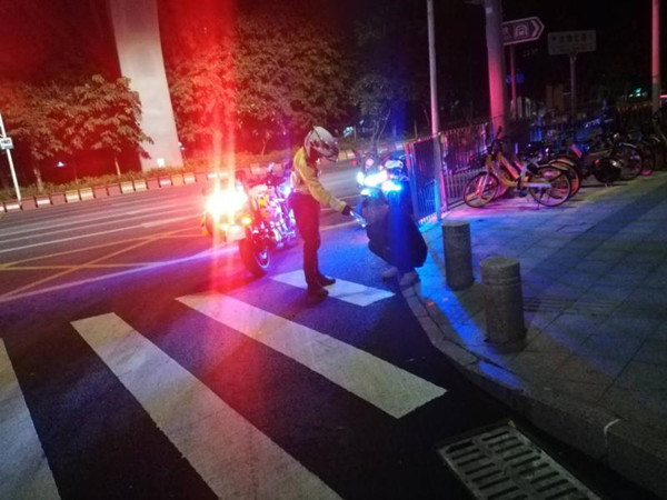 11月3日凌晨,羅湖交警大隊東湖中隊鐵騎隊員凌偉豪和劉尚鵬開展晨風行動,5時10分,巡邏至文錦北路出關方向時,看見斑馬線上躺臥著一名男子,隊員立即上前查看情況。