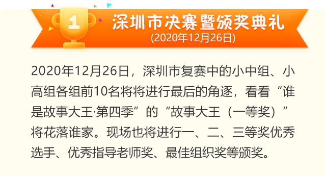 讓閱讀成為動人的風(fēng)景,讓故事的魅力感動深圳。為助力建設(shè)良好的青少年閱讀環(huán)境,激發(fā)學(xué)生閱讀興趣,倡導(dǎo)親子閱讀,共建和諧家庭關(guān)系。2020年,第二十一屆深圳讀書月主題活動“誰是故事大王·第四季”在共青團(tuán)深圳市委員會、深圳市關(guān)愛行動組委會辦公室的指導(dǎo)下再出發(fā)。更長的活動周期,更豐富的參與形式,更專業(yè)的賽制,“誰是故事大王·第四季”等你來解鎖與挑戰(zhàn)!