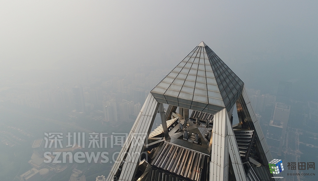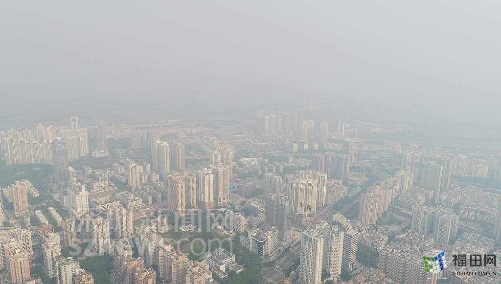 無人機(jī)在數(shù)百米高空俯瞰灰霾籠罩下的深圳中心區(qū),大半個城區(qū)都看不清楚。