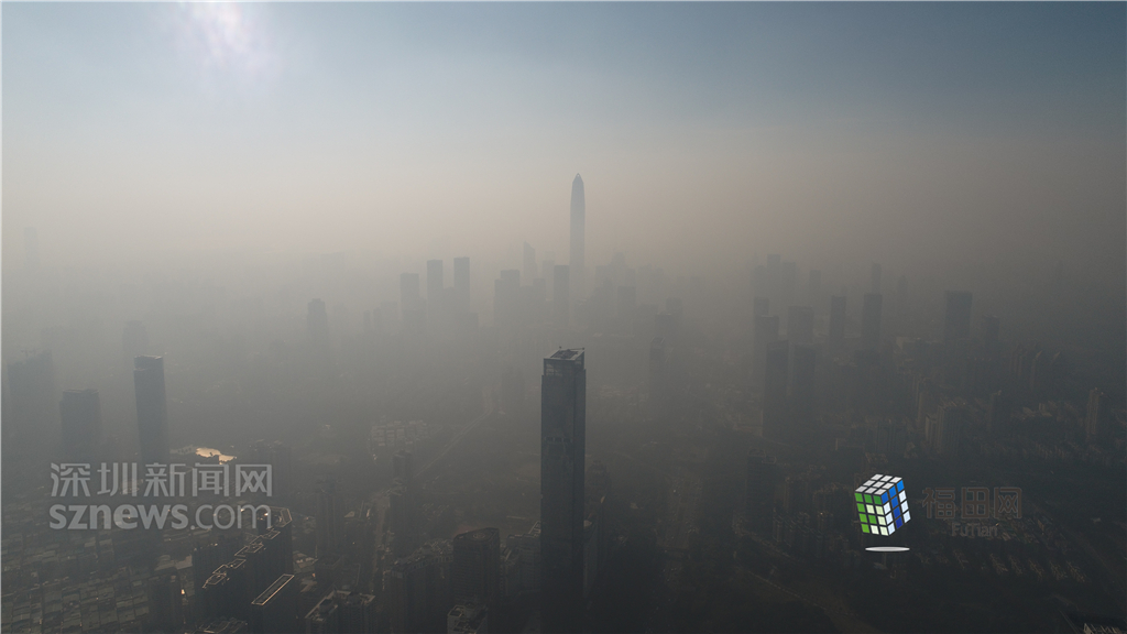1月18日上午,記者操控?zé)o人機(jī)俯瞰深圳中心區(qū)發(fā)現(xiàn),灰霾將天空“割裂”成一道涇渭分明的界線,把城市籠罩得如同一個(gè)充滿霧靄的森林。從平安金融大廈的上空遠(yuǎn)眺,西南面的深圳灣在灰霾的籠罩下變成了一片“沙漠”,東面的京基一百幾乎被灰霾“吞沒”,北邊平時(shí)肉眼可看的梅林山也因?yàn)槟芤姸容^低變得若隱若現(xiàn),南面的米埔濕地也被云遮霧繞。