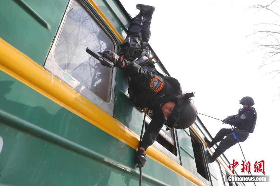 3月6日,北京鐵路公安處特警支隊鐵鷹突擊隊副大隊長鮑金鳳帶著男隊員進行科目訓(xùn)練。在男性占絕大多數(shù)的的特警支隊中,女特警格外亮眼。進入2018春運以來,30歲的鮑金鳳隊長擔負起新學(xué)員的訓(xùn)練工作,每天帶早操,一天四練,體能、射擊、綜合技能,高難度的科目動作,這個女隊長為男警員做示范。中新社記者楊可佳 攝