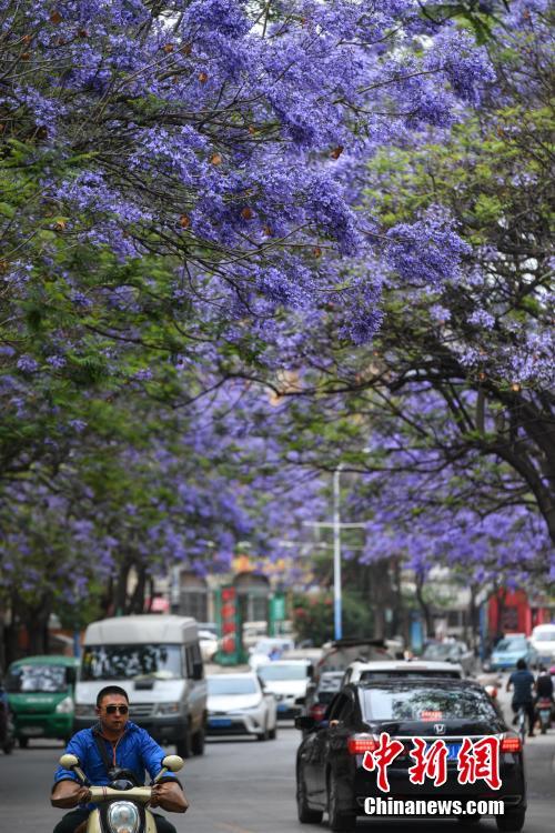 5月2日,昆明市區(qū)一道路兩旁的藍花楹盛開,車輛在“花街”穿行。 中新社記者 任東 攝