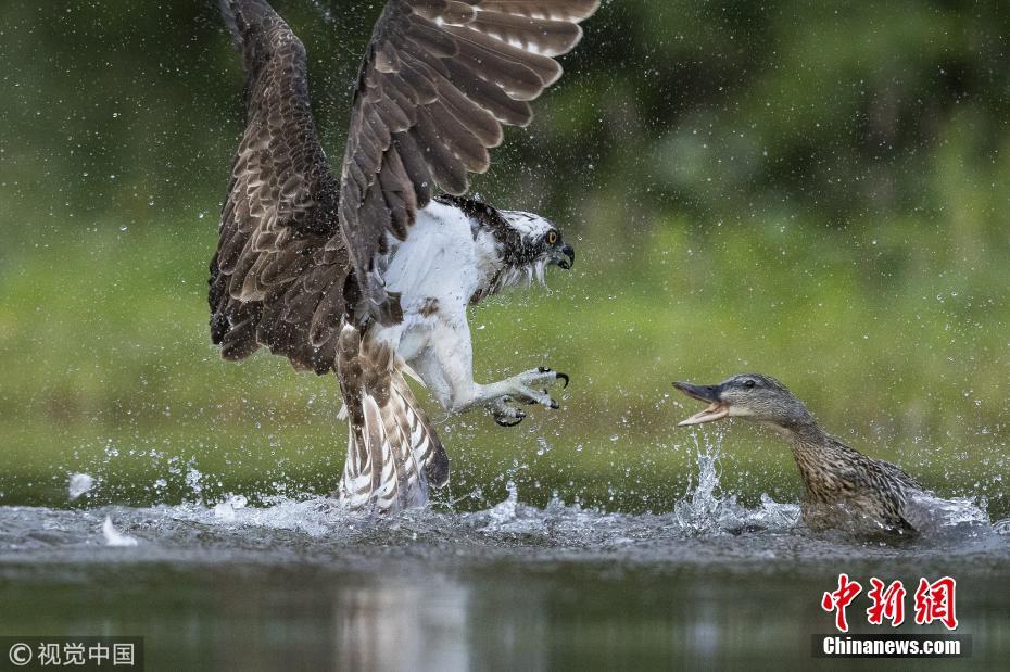 2018年6月21日訊(具體拍攝時(shí)間不詳),英國蘇格蘭高地,一只憤怒的綠頭鴨襲擊一只捕食的魚鷹。攝影師Andy Howard對于當(dāng)時(shí)眼前的景象感到十分震驚,并用鏡頭記錄下來了整個打斗過程。母鴨最后跳到魚鷹背上,害得魚鷹不得不丟下到手的鱒魚落荒而逃。他表示,沒有發(fā)現(xiàn)任何明顯的原因會引發(fā)這場打斗,母鴨并沒有幼崽需要保護(hù),而魚鷹也不吃鴨子?!盀榱粟s在晨光出現(xiàn)時(shí)拍照片,我必須凌晨2點(diǎn)鐘就起床,但我當(dāng)時(shí)并不知道有這么精彩的一出戲在等著我。” 圖片來源:視覺中國