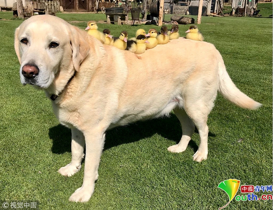 2018年5月22日訊(具體拍攝時(shí)間不詳),英國艾塞克斯郡芒特菲奇特城堡,一只名為弗雷德的拉布拉多和它“收養(yǎng)” 的9只小鴨子。小鴨子的媽媽突然失蹤,10歲的弗雷德就成了它們的“新爸爸”。