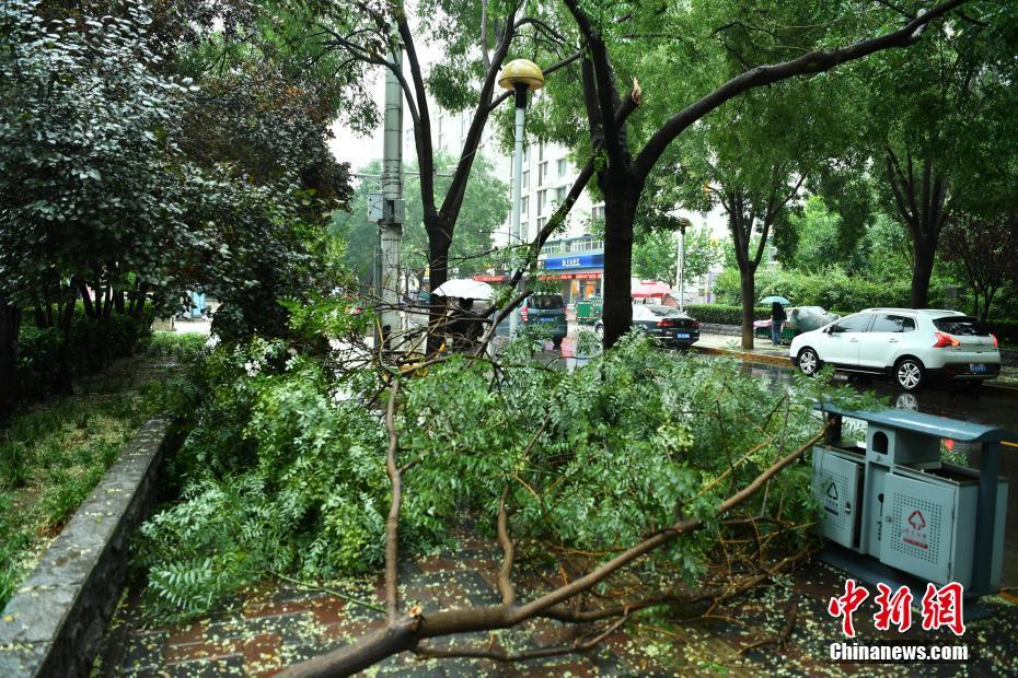 7月16日下午,河北石家莊街頭,樹枝被暴風雨折斷。當日,該省氣象臺發(fā)布暴雨藍色預警,承德、雄安新區(qū)、廊坊北部、石家莊中西部、邢臺西部等多地遭受暴雨襲擊。中新社記者翟羽佳 攝