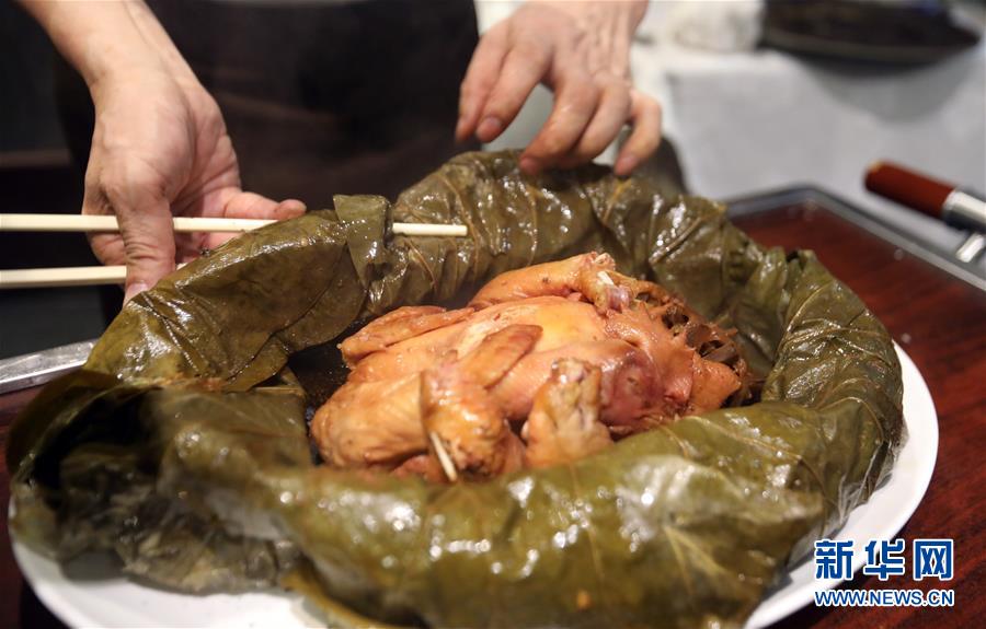 這是在香港灣仔杭州酒家拍攝的“叫化雞”(6月16日攝)。 金庸在武俠小說《神雕俠侶》中借郭靖之口說過: “為國為民,俠之大者?!蔽鋫b精神在香港備受推崇,有其心向中華文化的情感基礎。在這個國際美食之都,品味舌尖上的武俠味,內(nèi)中的感覺別有深意。新華社記者 李鵬 攝