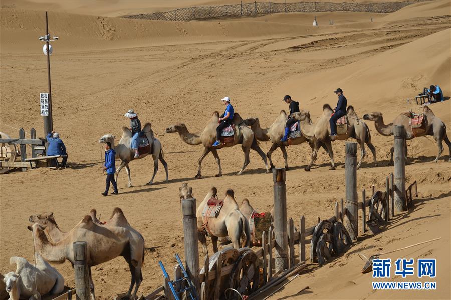 7月21日,在內(nèi)蒙古庫布其沙漠響沙灣景區(qū),游客體驗(yàn)騎駱駝。